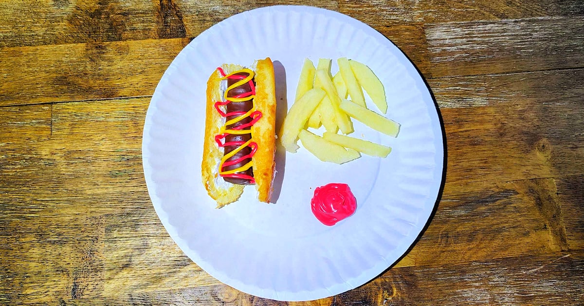 Twinkie Hot Dog- Finished - completed twinkie hot dog with apple fries and icing ketchup -Kids Activities Blog