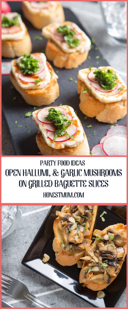 Good for events too, these bites are straightforward to make and completely scrumptious. So easy to rustle up they’re merely crispy French stick slices topped with garlic fried mushrooms or squeaky Cypriot Cheese, hallumi, sliced radishes, balsamic glaze and coriander.