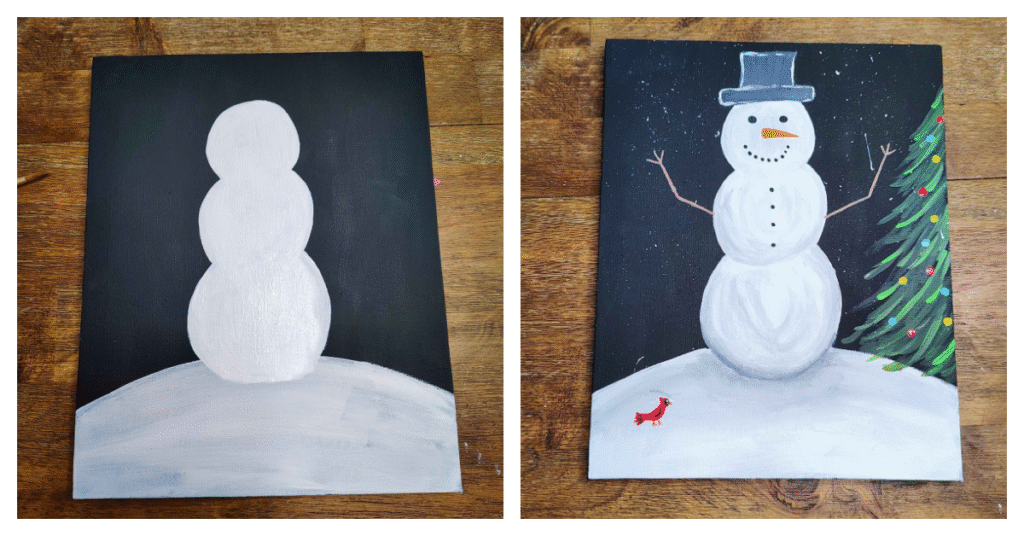 - Paint darker particulars on the bottom utilizing a lighter grey to create a shadow of the snowman.
