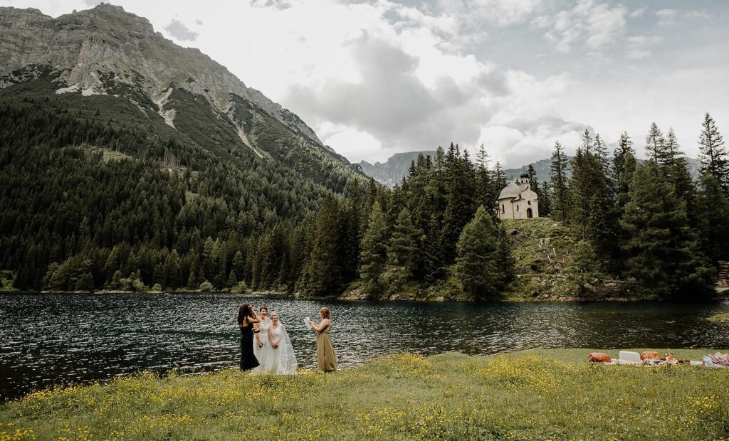 Kelsey: After our first look, we met up with our sisters and hiked to a lake for the marriage ceremony and a picnic.